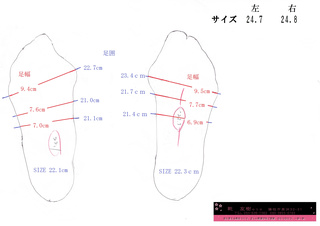 オーダー靴,オーダーメイド,シューズ,外反母趾,リウマチ,静岡,浜松,足の病院,痛み,悩み足に合わせる定規:採寸した足型から靴型を作るための定規を作成します。 数値18.6cm・・・足はおひとりお一人違うことが・・・。 ※ 痛み、悩み、外反母趾になる理由は靴が・・・ 足の特徴を確認出来る定規の作成 数値を確認。 靴型を作成するためには大切な作業 外反母趾対策,外反母趾予防,外反母趾対処, 足の採寸 足と健康を善い状態に維持するために 静岡,浜松,オーダー,靴,オーダーメイド,シューズ 足の採寸を行うということは足に合わせる為、足に合う靴がお客様には提供されることを基本意味します。 足の痛み、悩み、外反母趾、リウマチ、巻き爪、関節の変形、症状などに合わせる事。悪化を防ぎ、痛みの悩みの原因を靴が持たない為に大切な条件です。 健康を最優先にデザインと革、色などを決めていただきます。最良の靴を健康と今後の足と健康のために一緒に考えていきます。 足の状態、特徴、靴が足に合わない原因を知る。 採寸と医療